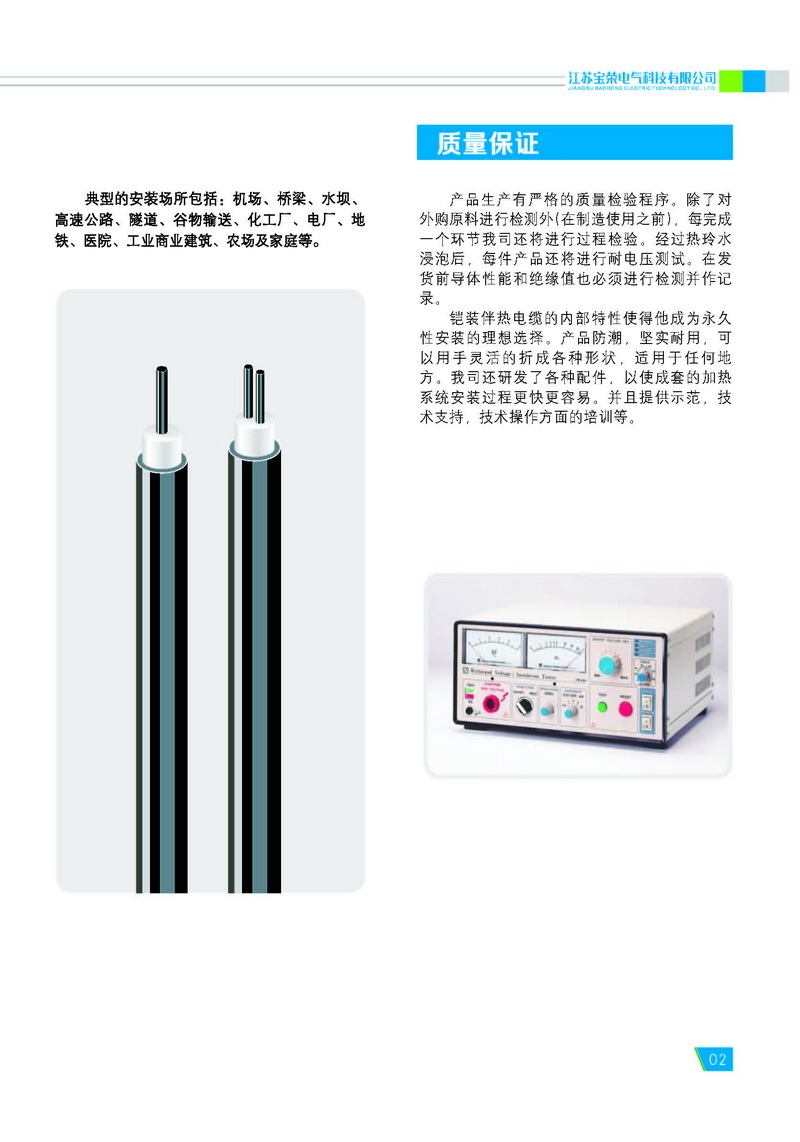 寶榮電氣專業(yè)生產(chǎn)不銹鋼保護(hù)管或銅 保護(hù)管的鎧裝伴熱電纜,又稱為鎧裝電熱 電纜或礦物絕緣伴熱電纜。 鎧裝伴熱電纜包含一個(gè)到兩個(gè)導(dǎo)體 (芯線)。該導(dǎo)體被嵌入高度壓縮的礦物絕 緣材料(氧化鎂)中,并同時(shí)被不銹鋼或銅 制成的無(wú)縫金屬套管保護(hù)。金屬外保護(hù)管 和導(dǎo)體的材料均根據(jù)需要選擇。