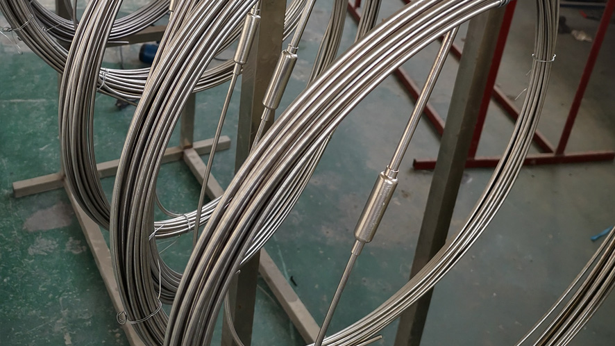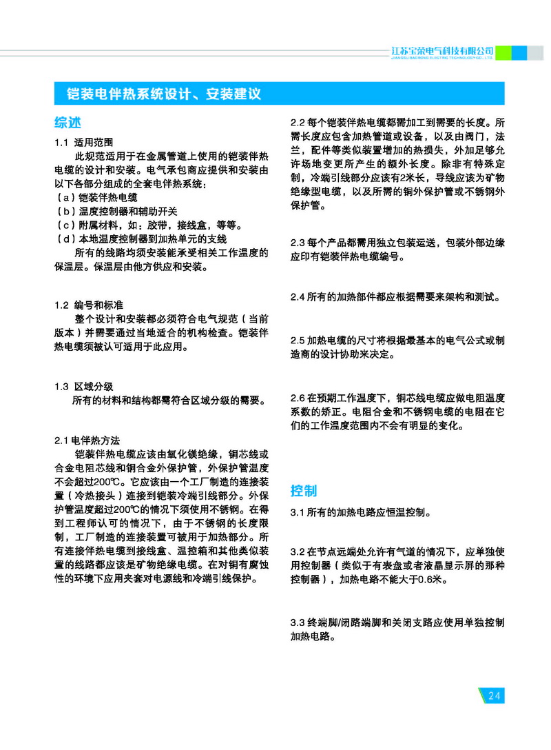 寶榮電氣專業(yè)生產(chǎn)不銹鋼保護(hù)管或銅 保護(hù)管的鎧裝伴熱電纜,又稱為鎧裝電熱 電纜或礦物絕緣伴熱電纜。 鎧裝伴熱電纜包含一個(gè)到兩個(gè)導(dǎo)體 (芯線)。該導(dǎo)體被嵌入高度壓縮的礦物絕 緣材料(氧化鎂)中,并同時(shí)被不銹鋼或銅 制成的無(wú)縫金屬套管保護(hù)。金屬外保護(hù)管 和導(dǎo)體的材料均根據(jù)需要選擇。